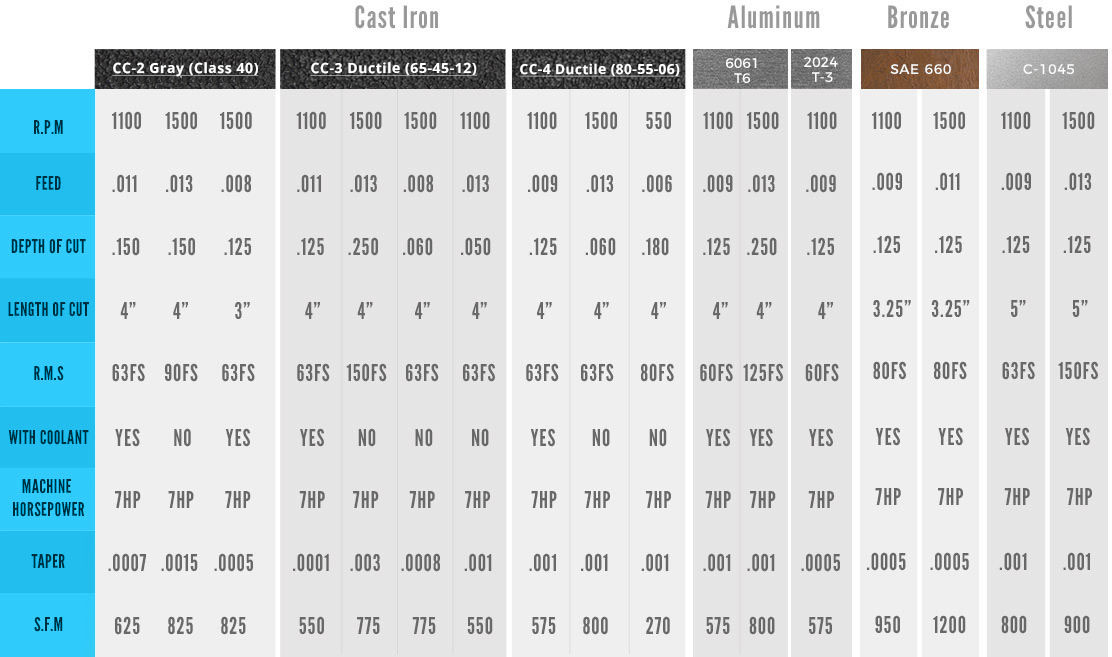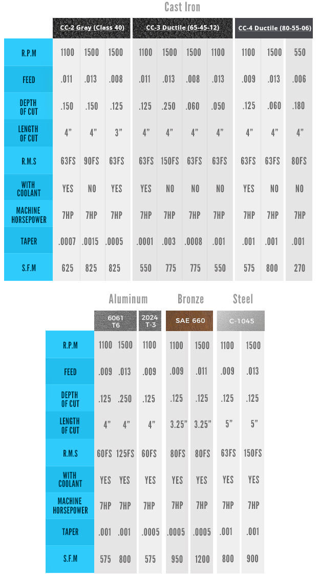 The operators were asked to achieve the optimal surface feed per minute (SFM) on iron while maintaining comparable depth of cut and surface roughness to those of the other three materials. Results show that all three grades of continuous cast iron significantly exceeded the conventional machinist handbooks for surface finish on cast iron. If you were to run the same test on a CNC machine or use one of the new high-tech inserts, rates comparable to those shown on the NGK chart would be possible.